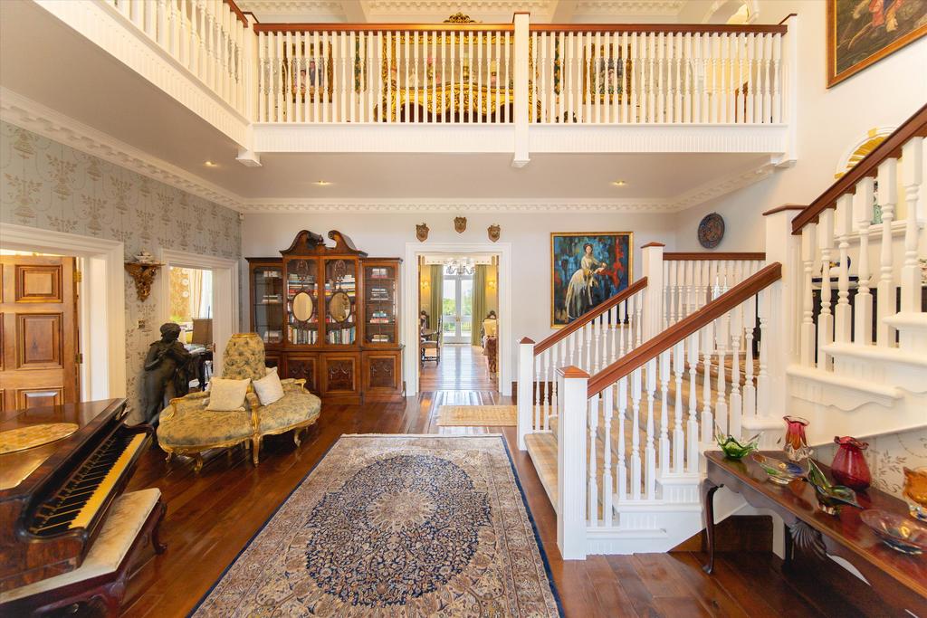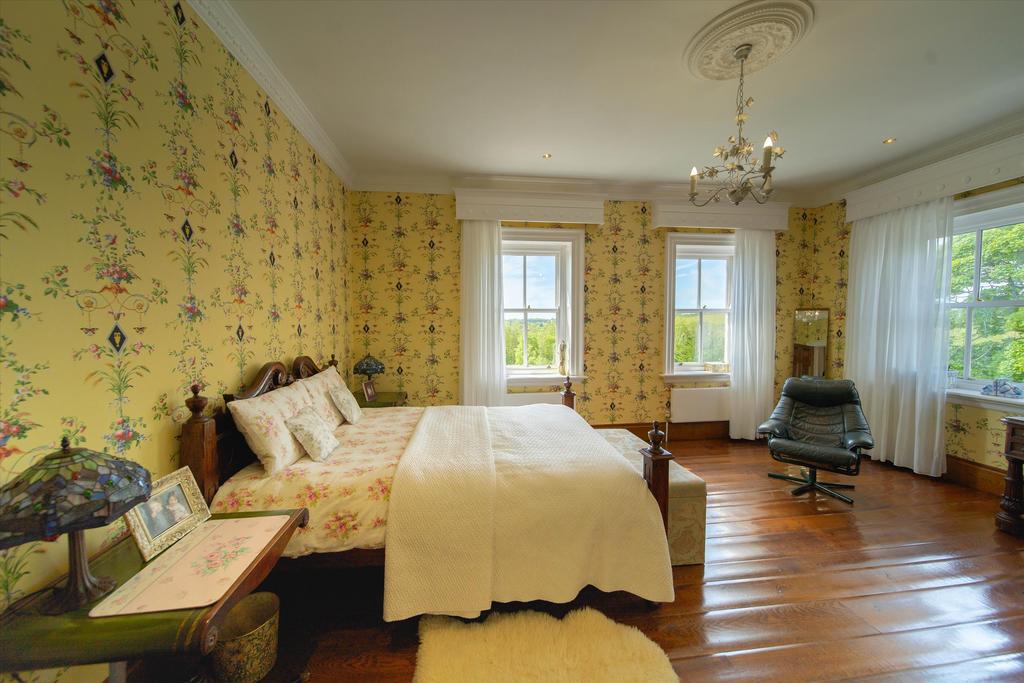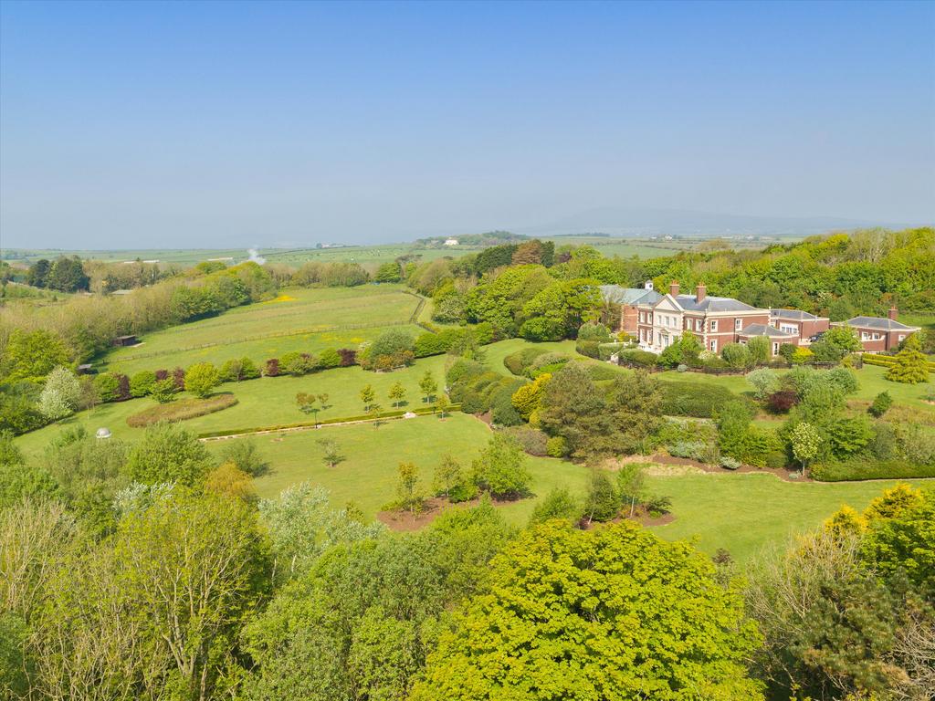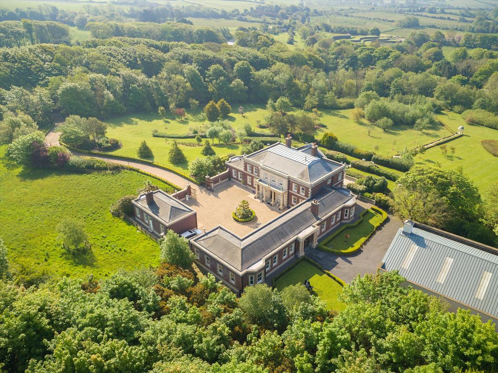 The house is approached through an electric gated entry and along a meandering gravelled driveway to the principal residence and guest cottage. There is a circular gravelled approach by the Portico entrance. The grounds are generously stocked with shrubs and professionally landscaped lawns and borders, to form a parkland garden with water feature, Pergoda, Tennis Court and sweeping striped lawns providing a haven of tranquillity, gently falling away to the south of the house. There is a further gated entrance to the gardens along Ballavale Road and one to the paddocks from the New Castletown Road.