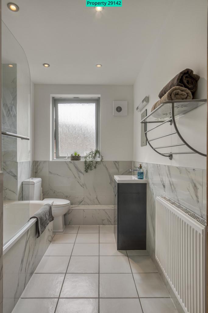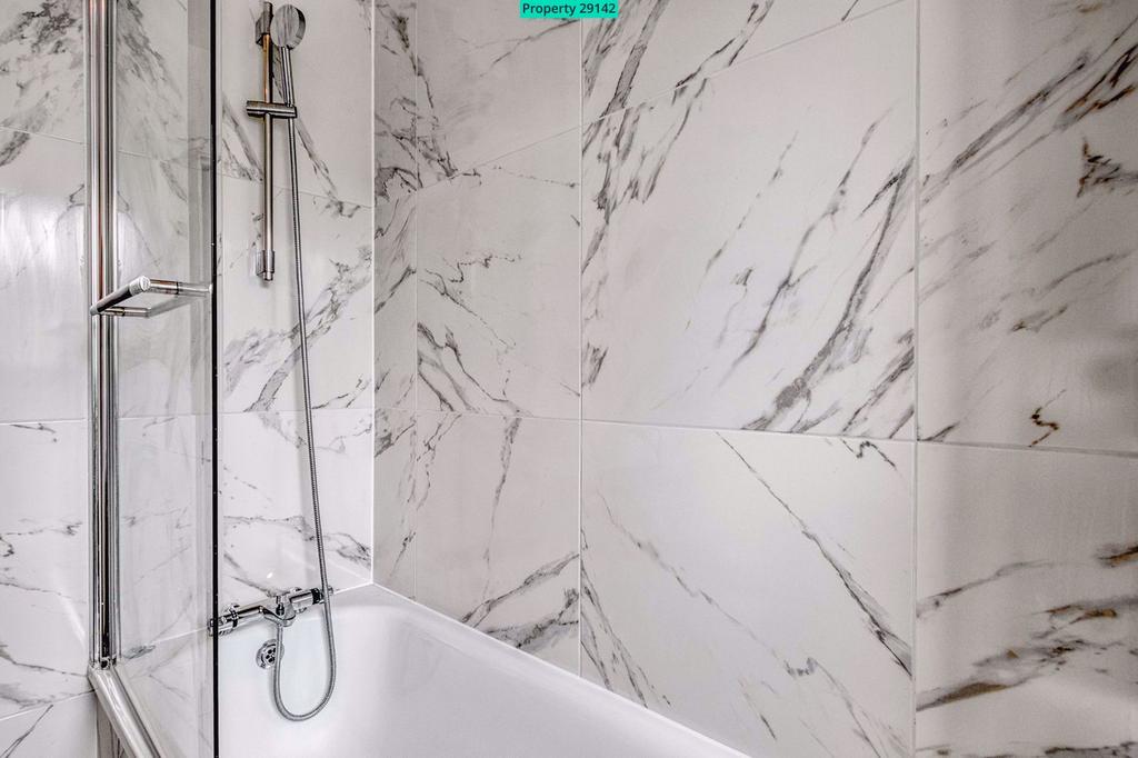 •Stylish bathroom with bath and shower over, finished with marble-effect tiling