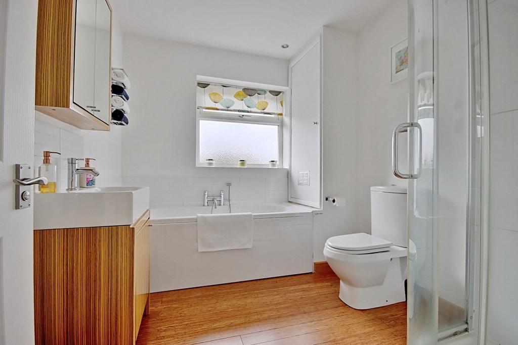 Comprising of a modern style suite to include; Bath with tiled surround, Vanity style wash hand basin, W.C., corner shower unit, heated towel rail, ceiling light point, storage cupboard and double glazed window to rear aspect.