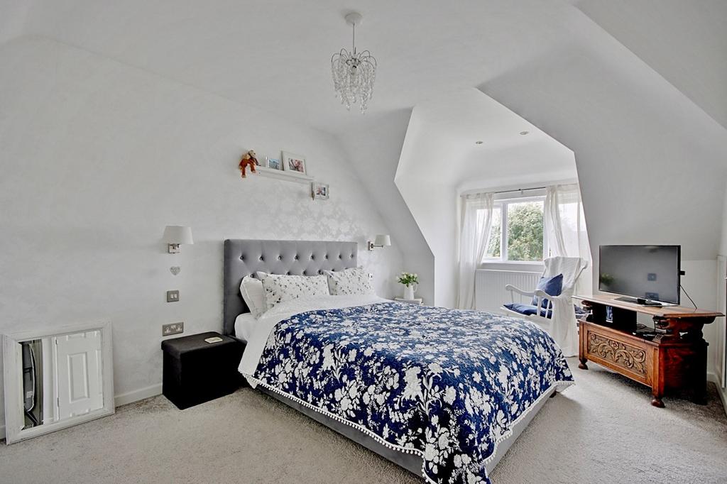 With double glazed dormer window to rear aspect, a range of built in storage into the eaves with coloured glass sliding doors, further storage cupboard, two wall light points, ceiling light and door through to;