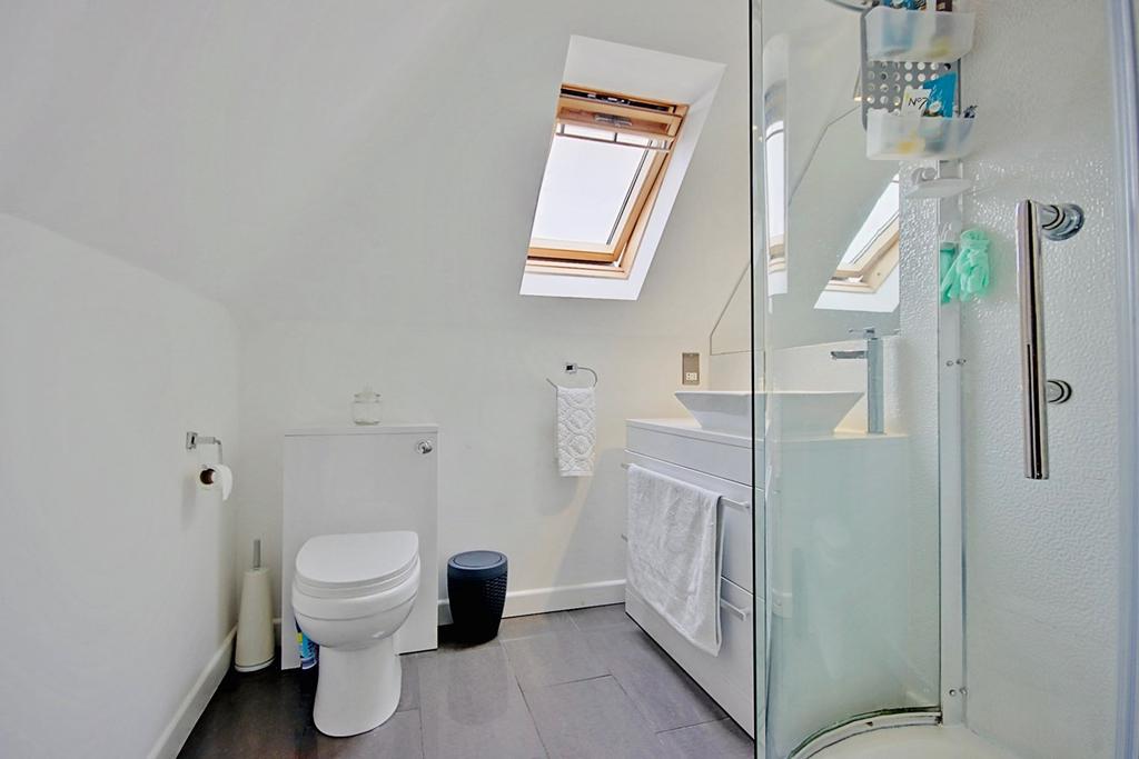 Comprising of a suite to include; Corner Shower unit with inset tiling, Vanity style was hand basin, W.C., tiled floor, heated towel rail and velux window.