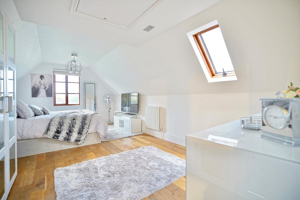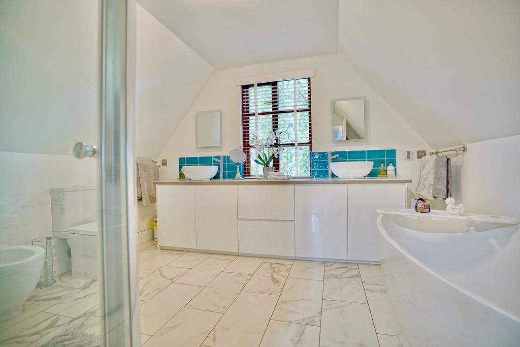 Double glazed window to front, two eaves storage spaces, fitted in a six piece suite comprising low level WC, bidet, twin counter top circular mounted was hand basins with base cupboards and drawers, oval free standing bath, double shower cubicle with drench style shower head and hand held attachment, complementing tiling, heated towel rail, tiled flooring with electric under floor heating, extractor.