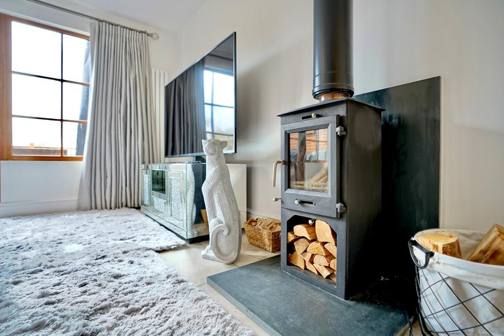 Ceiling fan, two contemporary style radiators, wood burning stove, stairs to first floor, cupboard housing consumer unit.