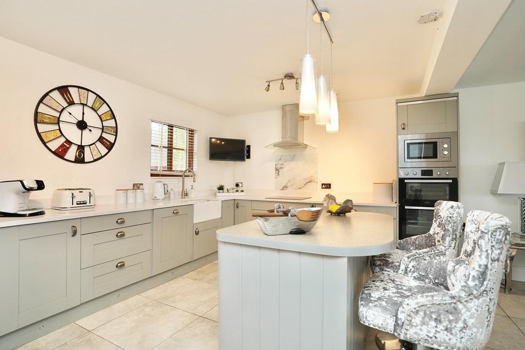Re-fitted in a range of base, drawer and wall mounted units with complementing granite work surfaces and up-standers, Butler style sink with mixer tap, integrated electric hob with back plate and extractor hood over, electric oven and microwave, integrated dishwasher, plinth lighting, central island/breakfast bar with drawers and base unit, wine cooler and plinth lighting, free standing American style fridge freezer, concealed wall mounted gas central heating boiler, contemporary style radiator.