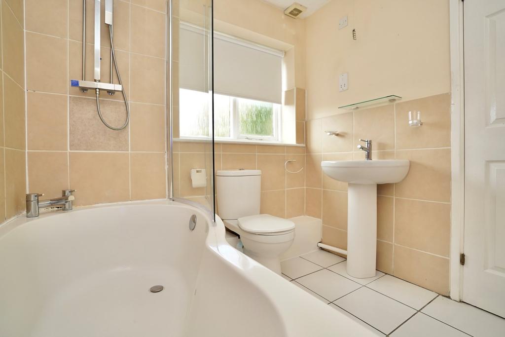 Window to side aspect, fitted in a three piece suite comprising low level WC, wash hand basin, 'P' shaped panel bath with shower screen and shower over, radiator, complementing tiling, tiled flooring.