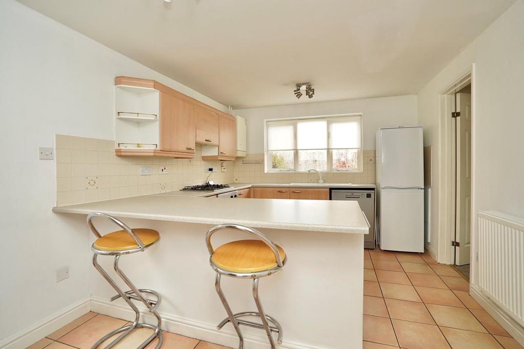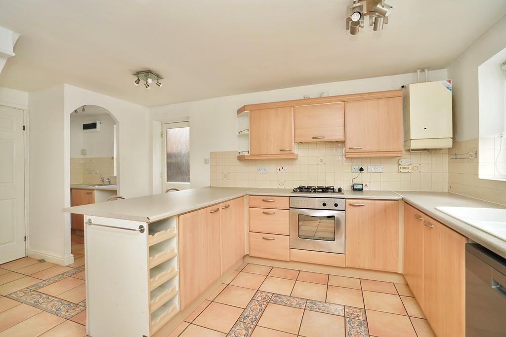 Window to rear aspect, fitted in a range of base, drawer and wall mounted units with complementing work surfaces and tiling, one and a half bowl single drainer sink unit with mixer tap, space for fridge freezer, space and plumbing for dishwasher, integrated electric oven and gas hob with cooker hood over, wine rack, radiator, tiled flooring, under stairs storage cupboard, door to side, arch to