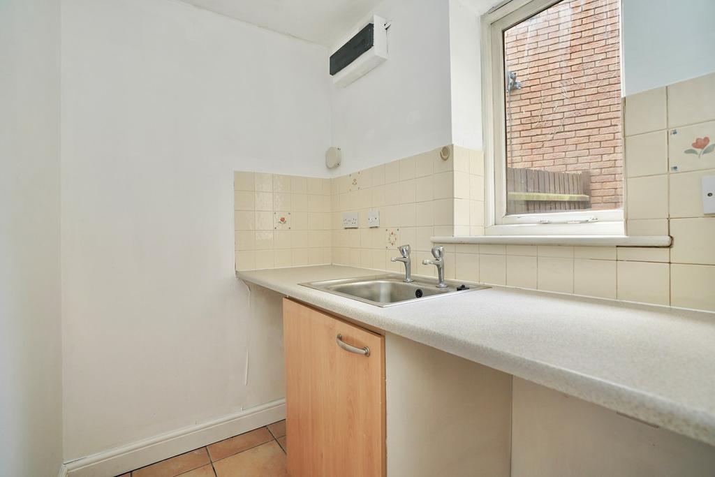 Window to side aspect, fitted with a base unit and work surface, stainless steel sink unit, complementing tiling, tiled flooring.