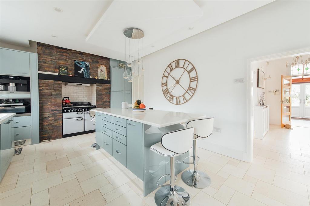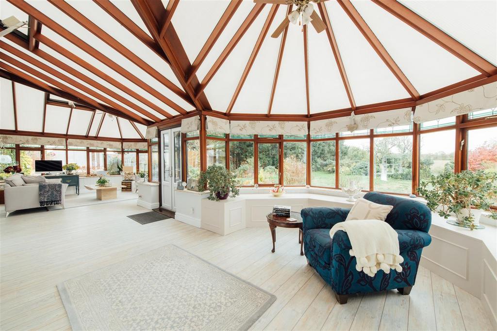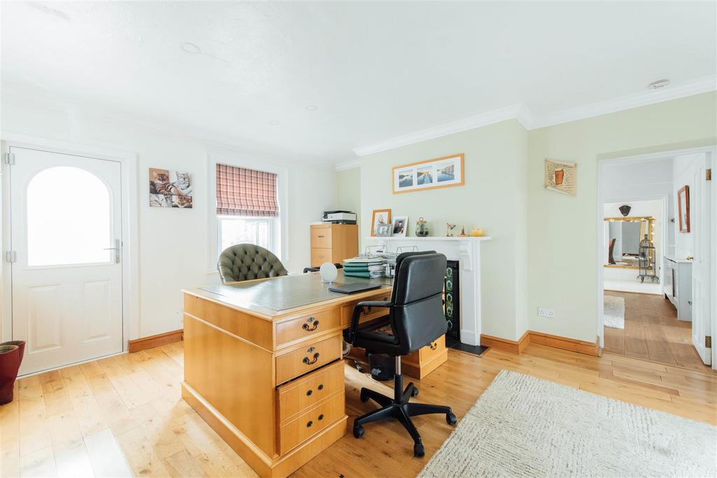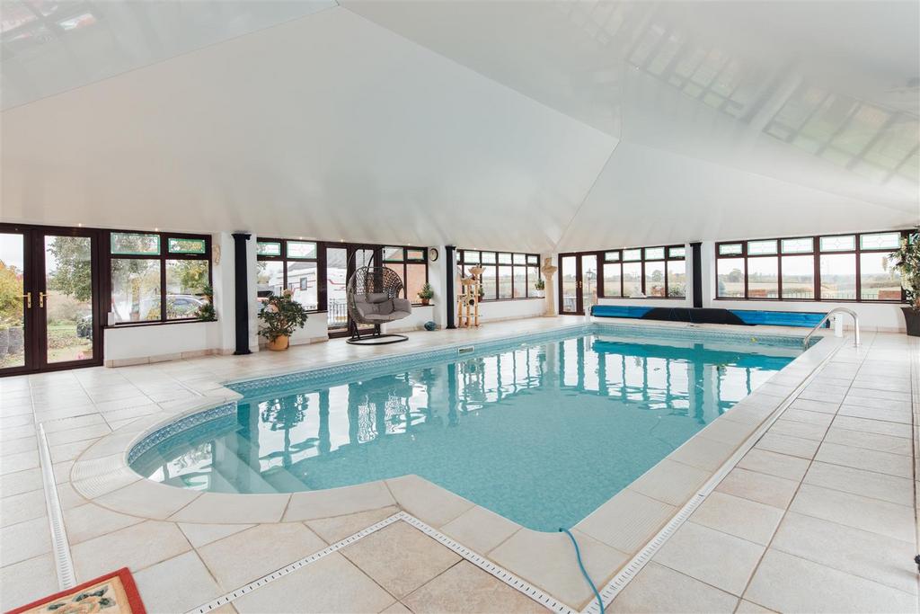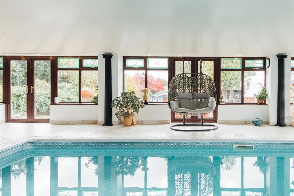 Ground Floor - The property is entered via the large conservatory with steps leading down to the pool area. Double doors lead to the dining room and living room., Door to the hallway with stairs rising to the first floor landing. Door to dining room and kitchen. Door to the living room which has a fireplace with a wood burner, and access to the conservatory. The dining room has a fireplace and access to the conservatory. Door to the kitchen and a door leading to the study which has windows to the front and rear aspects and a glazed door to the exterior. A door leads into the utility room which is fitted in a range of units to wall and base levels with worksurfaces over and a one and a half bowl sink/drainer, windows to the front and side aspects, door to rear and a staircase leading to the secondary first floor. The kitchen is located at the rear of the property and has been re-fitted in a range of units to wall and base levels with worksurfaces over and an inset double sink/drainer, space for range cooker with an extractor hood over, integrated dishwasher, microwave and coffee machine, space and plumbing for an American style fridge/freezer. A door leads to the rear lobby which access via a door to the exterior, staircase leading to the basement which houses the temperature and heating controls for the swimming pool. From the rear lobby a door leads into the bootroom which has an ornamental fireplace, fitted storage cupboard, wall mounted wash hand basin and w.c.
