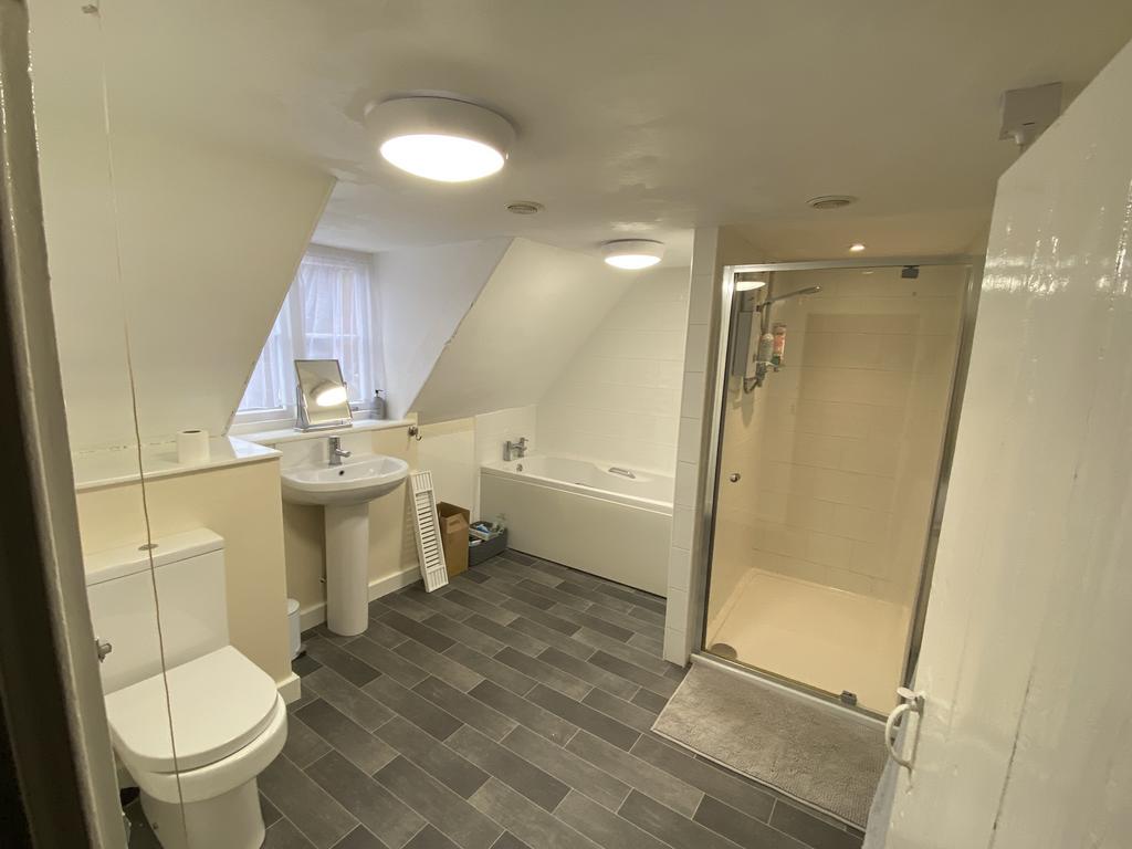 Large family bathroom with 4 piece modern suite comprising shower cubicle with electric shower and tiled splash back. Bath with mixer tap and tiled splash back, hand basin and WC. Vinyl to floor.