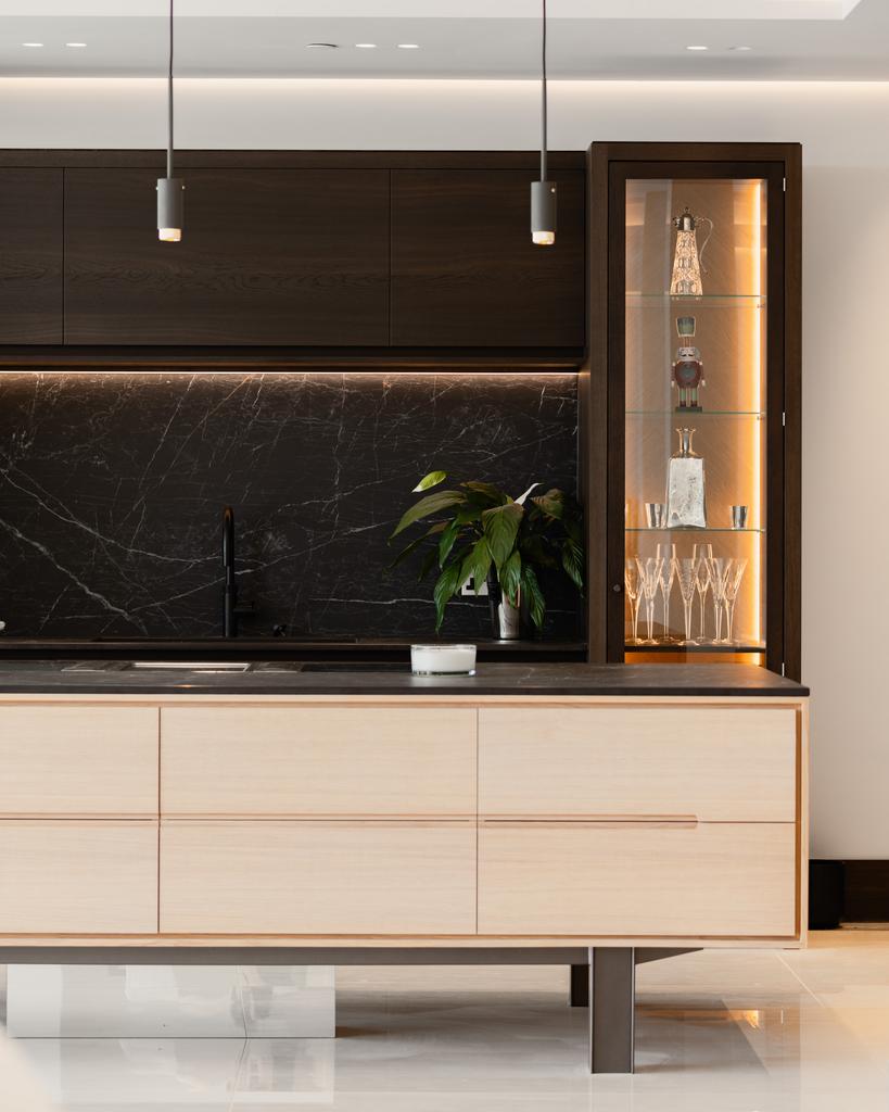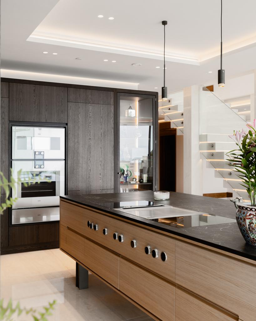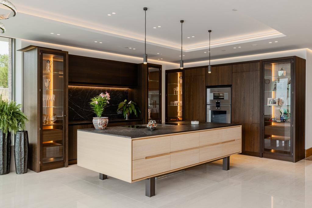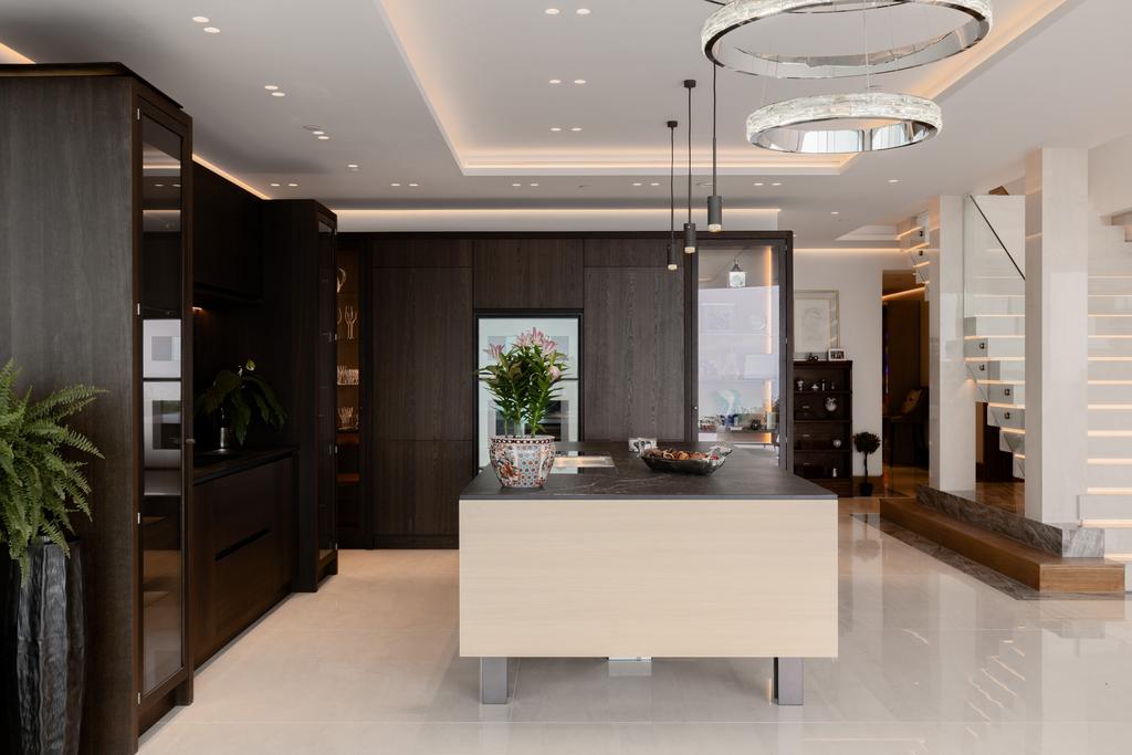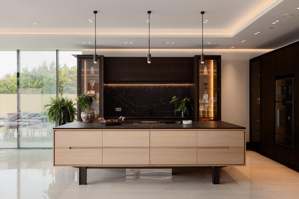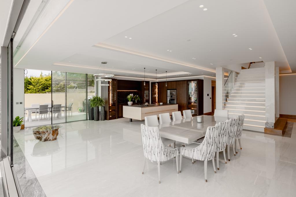 Ever intrigued by what lies beneath, the marble flooring and exquisitely engineered cantilevered staircase lead down to the main 'great room' with bespoke walnut kitchen, handcrafted by artisans — complete with Gaggenau appliances — an adjacent dining area for entertaining, and a sitting area with living flame fire and bespoke cabinetry. The chef’s private kitchen/utility space hides domestic clutter, and a guest cloakroom features a beautiful onyx floor. A further reception space/meeting area links the climate-controlled wine cellar and 12-seat home cinema with up-to-the-minute audio and visual systems, laser projection, and a 185” screen.