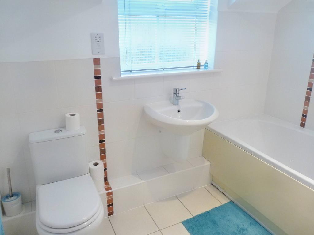 Bathroom - vinyl flooring, white walls/part tiled - bath with hand held shower attachment, WC and pedestal sink, recess spotlights