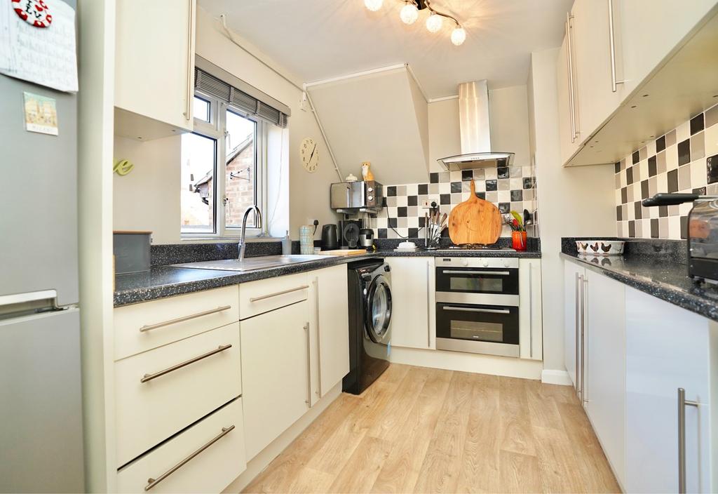 Fitted in a range of base and wall mounted cabinets with complementing work surfaces and tiling, integral electric oven and gas hob with suspended extractor unit fitted above, single drainer sink unit with mixer tap, appliance spaces, UPVC window to front aspect, glazed internal door to Living Room, drawer units, space for fridge freezer, composite flooring.