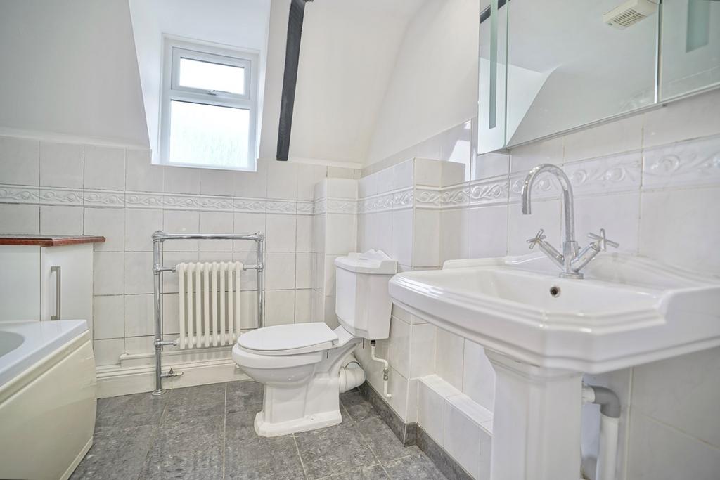 Re-fitted in a three piece suite comprising 'P' shaped panel bath with independent power shower over and glass shower screen, complementing tiling, low level WC, wash hand basin, original style radiator, heated towel rail, UPVC double glazed window to side aspect, recessed down lighters, wall mounted vanity mirror, ceiling mounted extractor fan.