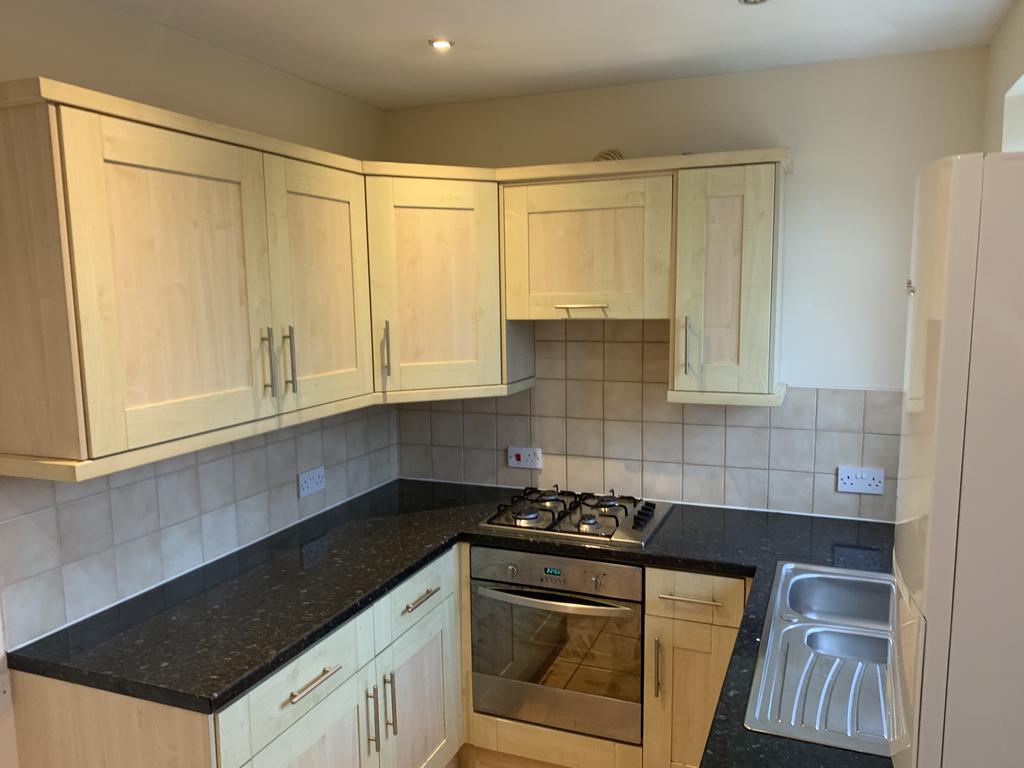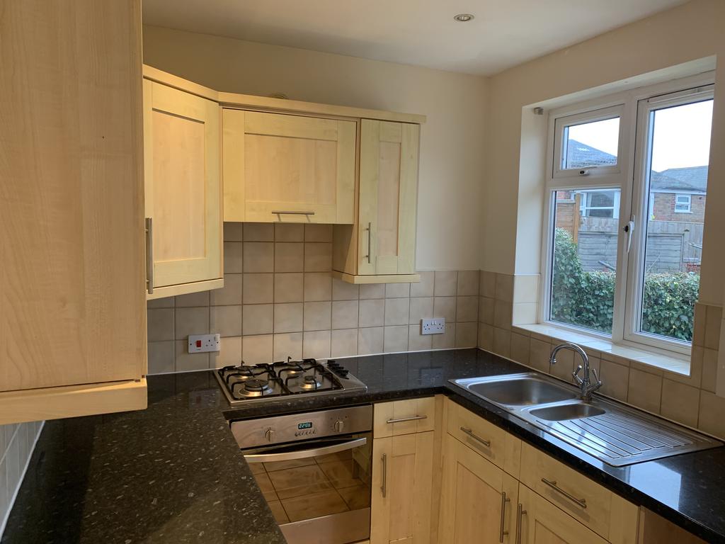 The modern kitchen is smart and functional, fitted with natural wood cabinetry, granite-effect worktops, a built-in oven and gas hob, as well as space for further appliances – a fantastic layout for keen cooks. Each of the three bedrooms delivers clean, modern spaces with double glazed windows and new carpets, two generous doubles and a single that could alternatively suit as a study or nursery.