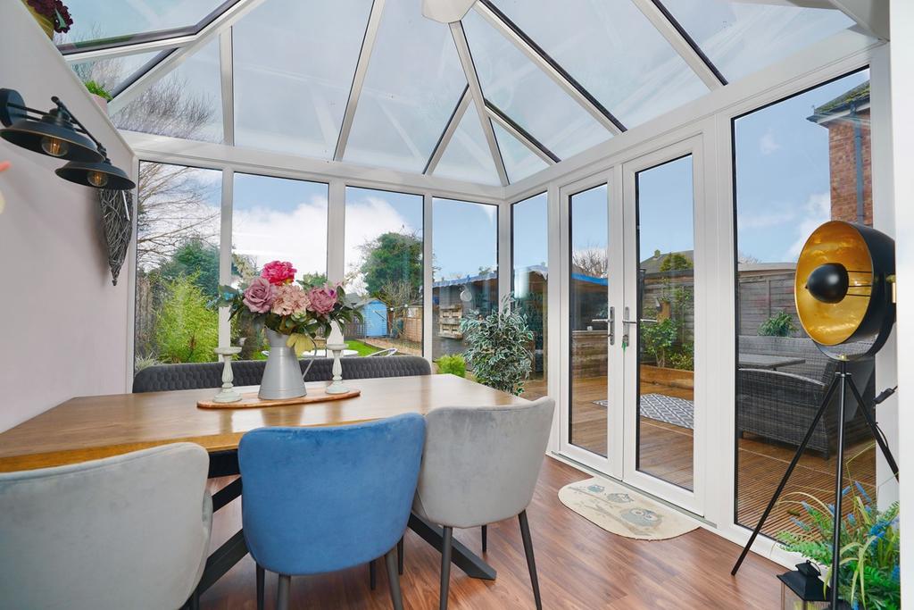 Of UPVC double glazed construction with part vaulted ceiling, reinforced glazed roofing, French doors access garden terrace to the rear, laminate flooring.