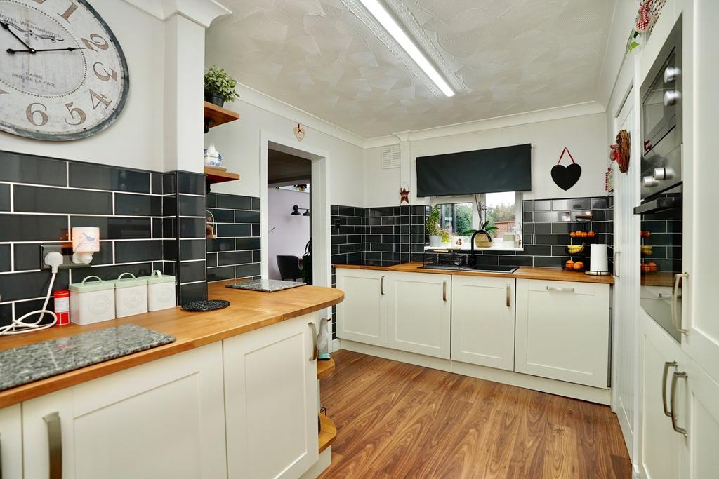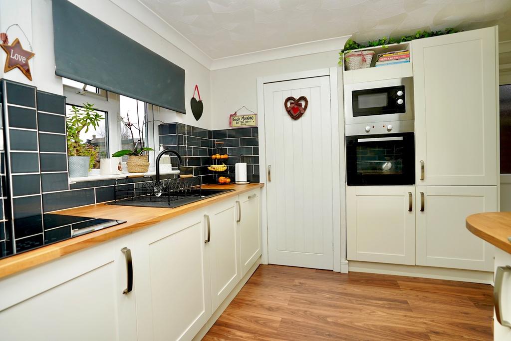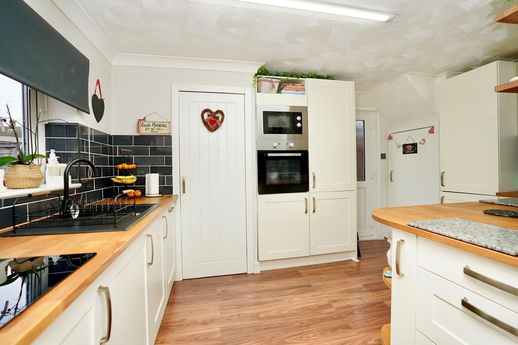 Fitted in a range of Shaker style cream base and wall mounted cabinets with complementing Beech wood work surfaces, inset single drainer sink unit with mono bloc mixer tap, corner shelf display unit, extensive contemporary tiling, under stairs storage cupboard, pantry with shelving, new consumer unit, UPVC door and window to side and rear aspect, a selection of integrated appliances, incorporating automatic washing machine, fridge freezer, automatic dishwasher, induction hob, integrated microwave, conventional electric oven, coving to ceiling, laminate flooring.