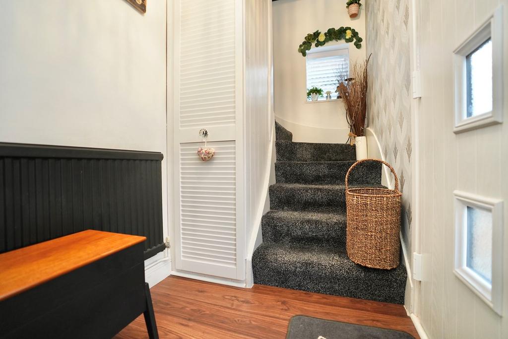 Single panel radiator, cloaks cupboard, stairs to first floor, laminate flooring.