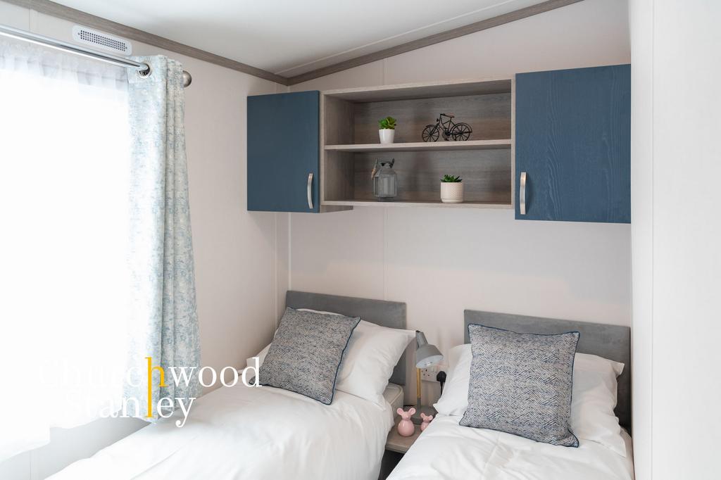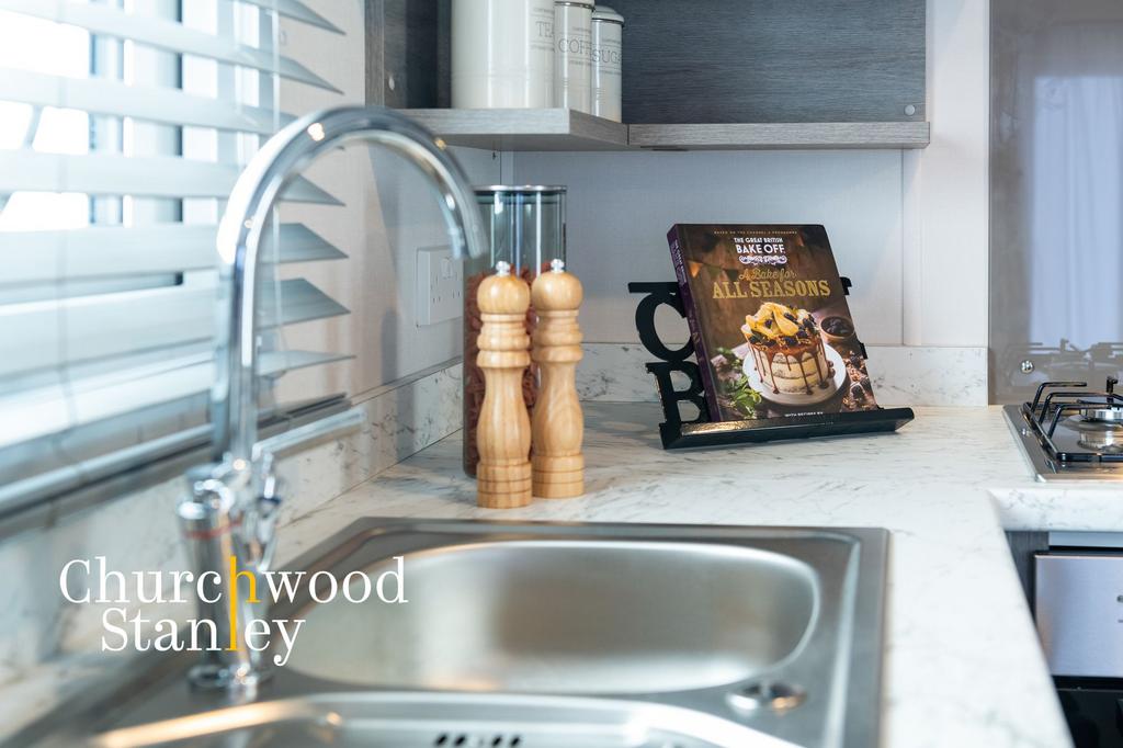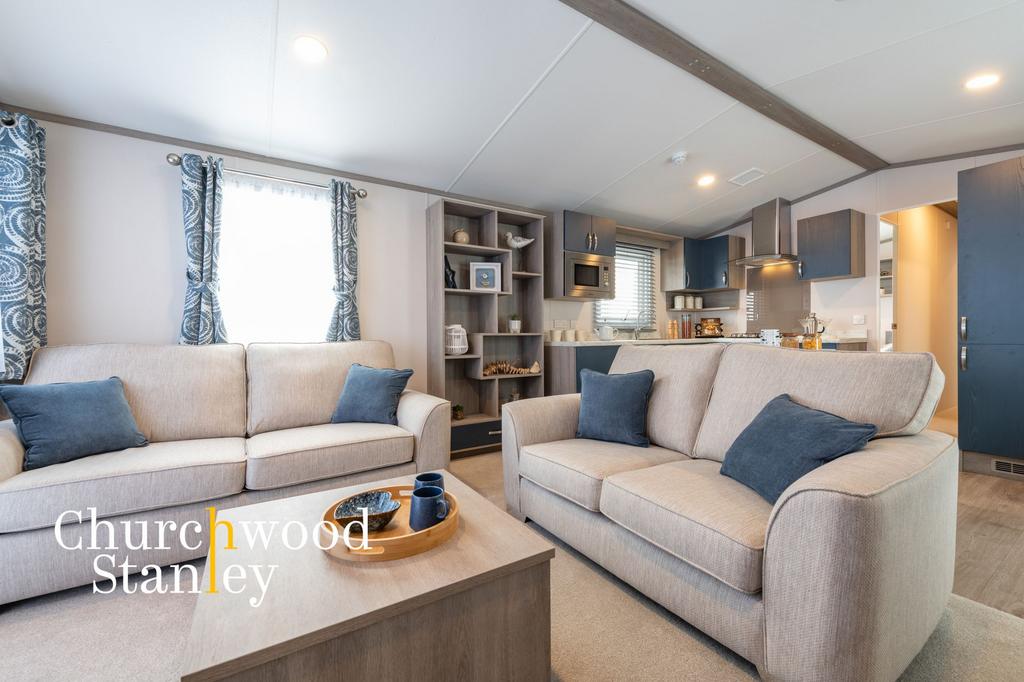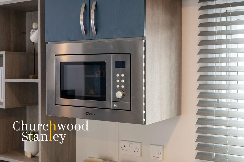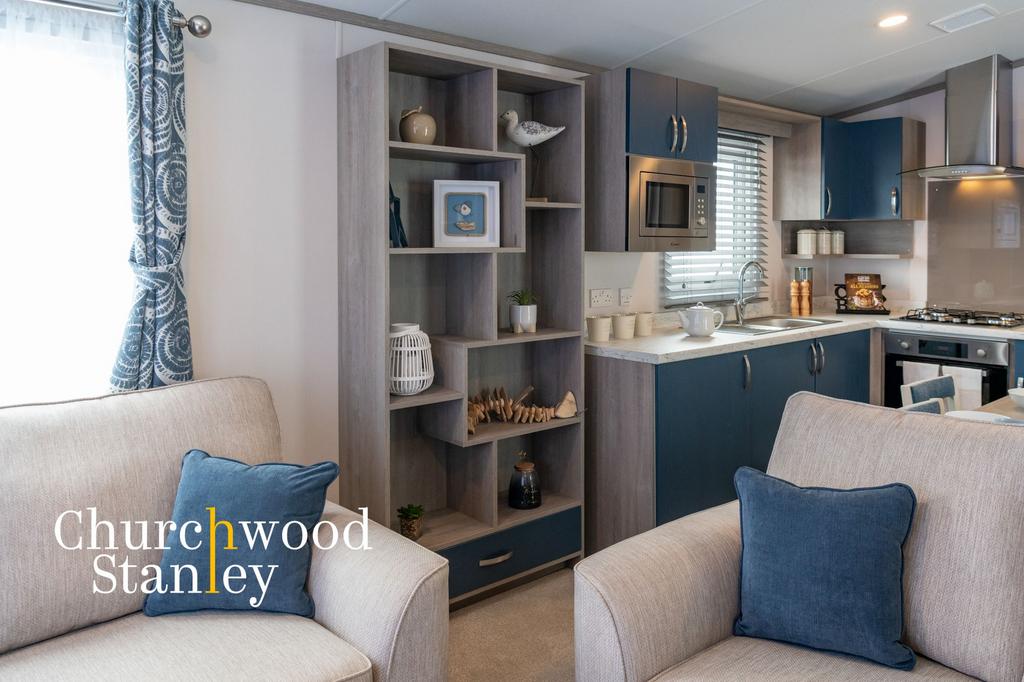 There are plenty of clever design points built-in, such as the feature electric stove with storage shelving above, great for cosy nights in, and the striking use of contemporary blues in the kitchen units, soft furnishings and feature wall in the master bedroom.