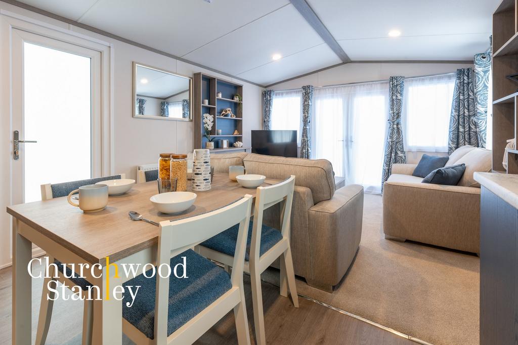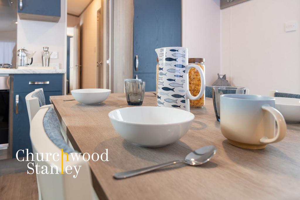 Domestic sized kitchen units with integrated fridge freezer and microwave. Oven and 4-burner hob with curved glass cooker hood. Freestanding dining table and four chairs. Bench seat and coat hooks