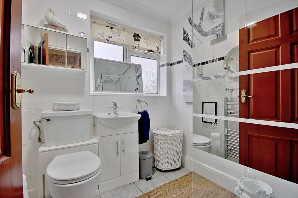 Modern style suite featuring a double shower with wall mounted electric shower. Low flush unit toilet and sink with inbuilt vanity storage cupboard. Tiled walls. Obscured double glazed window. Ceiling light point and towel radiator.