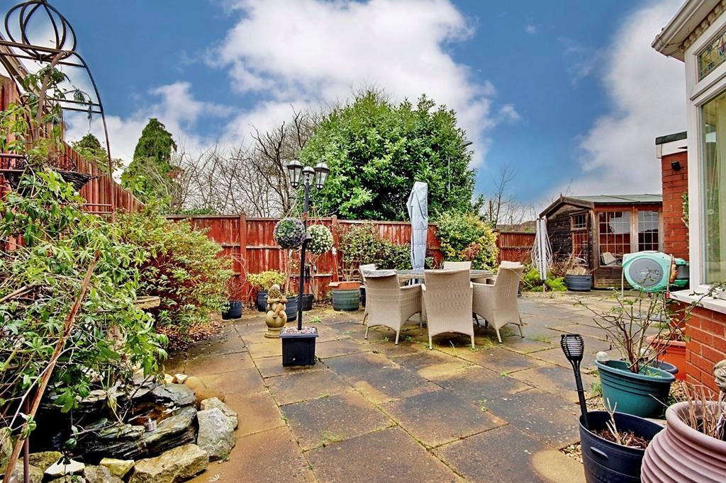 Enclosed wrap around low maintenance rear gardens with patio and gravelled areas. Feature summer house. Fence surround. Access to utility room.