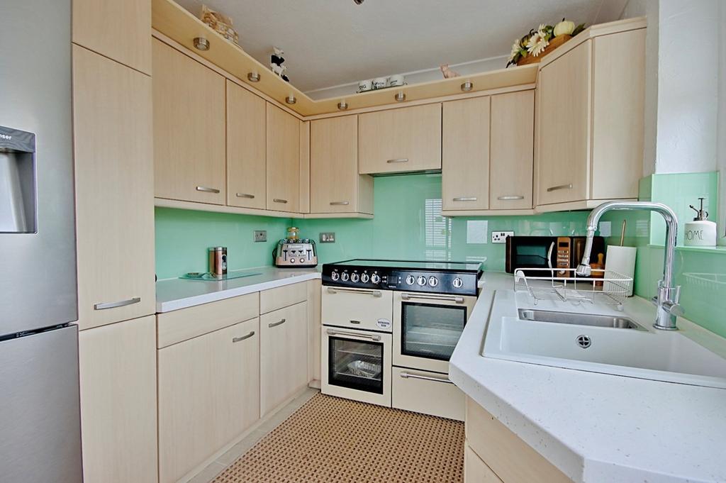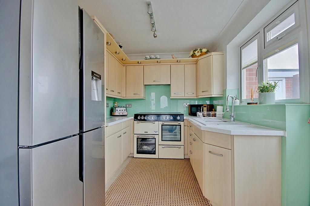 7' 5" x 16' 0" (2.26m x 4.88m) Modern style fitted kitchen with matching base and wall storage units, featuring integrated appliances including; 1.5 Sink with chrome mixer tap and drainer, Fridge & Five circle 'Cookmaster' oven. Space for large American fridge/freezer. Splash-back. Double glazed window and door to the side aspect. Tall radiator unit and ceiling light point.