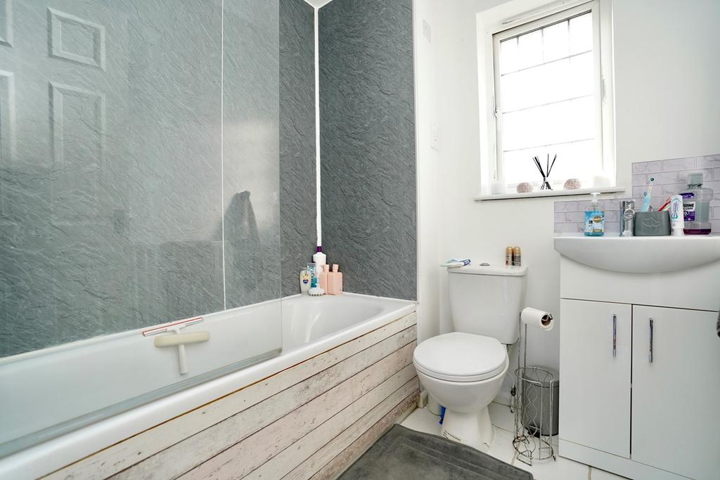 Re-fitted in a three piece white suite comprising low level WC, vanity wash hand basin with mixer tap and tiling, UPVC window to rear aspect, pane bath with folding shower screen and independent shower unit fitted over, ceramic tiled flooring.