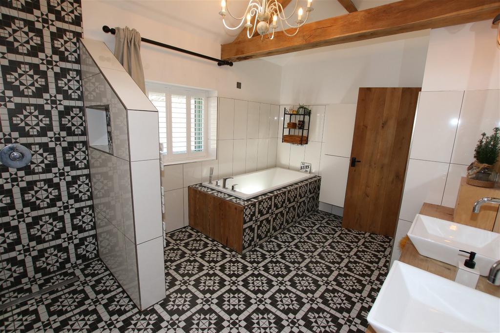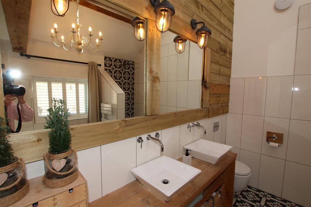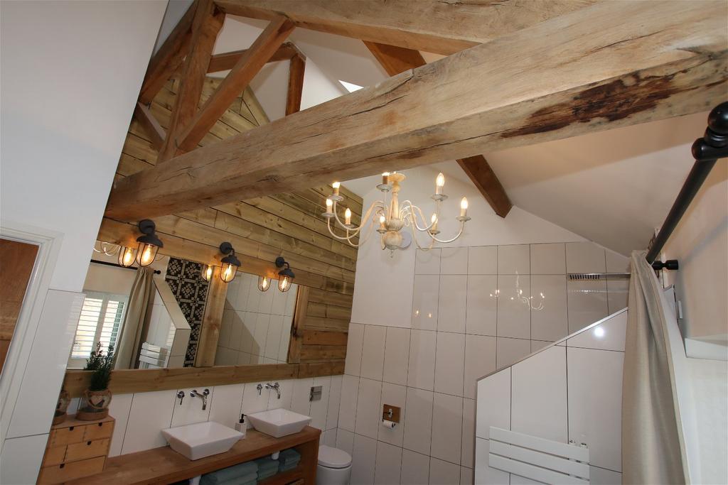 HOUSE BATHROOM 13' 2" x 9' 5" (4.01m x 2.87m) A quite outstanding Family Bathroom, presented to a delightful standard and providing a five-piece suite which includes twin vanity wash hand basins set to a bespoke timber plinth, there is a low flush WC, deep over-sized panel bath and generous shower area presented in the wet room style with thermostatically controlled cascade shower. The room once again displays ceiling timbers, a Velux skylight window and contemporary style radiator. From the entrance hallway at ground floor level, a staircase then provides access to the occasional Mezzanine Bedroom Four.
