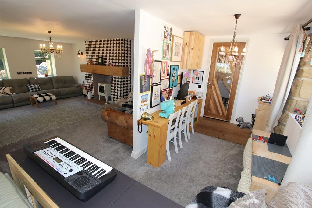 OUTSTANDING OPEN PLAN GROUND FLOOR LIVING AREA - THE WHOLE AREA BENEFITTING FROM UNDER FLOOR HEATING LOUNGE: 20'6" x 13'3" Impressively proportioned, the lounge area also enjoys excellent levels of natural light provided in part by bi-fold doors which give access to the rear garden and patio. There is a feature timber panelled wall with wiring for the mounting of a flat screen television. There are also two wall light points and a beautiful fireplace with stone hearth and inset. DINING AREA: 13'10" x 11'5" A bank of windows to the front of the property provide excellent levels of natural light. There is timber panelling to the staircase wall with access also provided to a useful under stairs store. STUDY AREA: 7'1" x 13'3" Having a connecting door through to the Entrance Hallway and open-plan aspect to the adjoining Lounge and Dining Areas. BREAKFAST KITCHEN: 14'3" x 15'2" A beautiful and spacious Kitchen, designed to take full advantage of the wonderful views down the valley and providing an extensive range of grey gloss fronted units comprising of an expanse of roll edge work top surfaces, with inset one and a half bowl stainless steel sink unit. There are further base and eye level storage cupboards in addition to which are tall storage units to the side of the fridge/freezer position and the sale will include the integrated Whirlpool double oven, AEG five-ring induction hob with extractor canopy over and bluetooth Opalum sound system. The room also displays wonderful exposed ceiling timbers with an entrance door giving access to the rear garden.