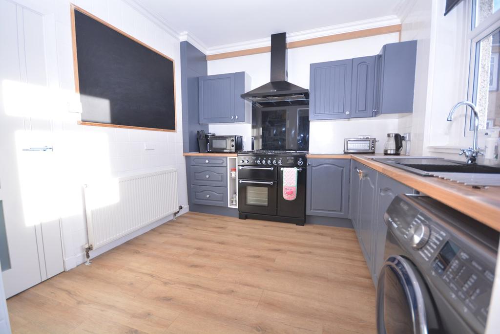 4.28m x 2.90m (14' 1" x 9' 6") Stylish dining sized kitchen complete with contemporary grey shaker style wall and base units providing ample storage with complementary oak effect work surface, pantry storage cupboard, plumbing and space for range style cooker, fridge freezer and washing machine, anthracite sink and drainer, walk in storage cupboard housing combi boiler, tiled around walls, oak effect luxury vinyl flooring, double glazed window to the rear and door to the gardens.