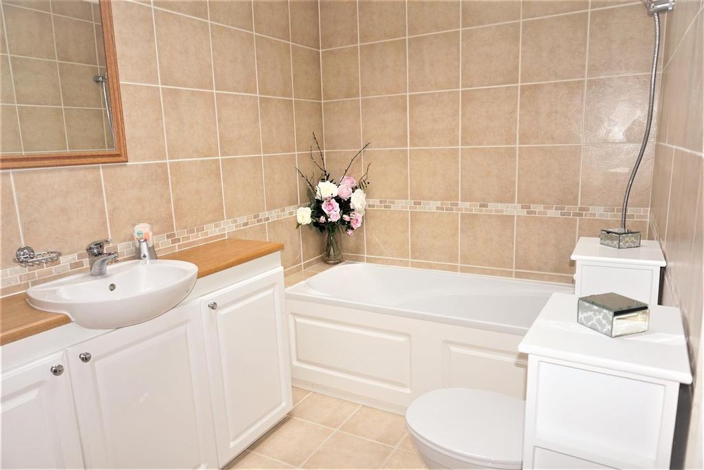 En Suite Bathroom - 2.69m x 1.78m - Modern white bathroom suite comprising panelled bath with mixer taps and shower attachment, vanity unit with inset sink and mono bloc tap with storage below and low level WC. Fully tiled walls and floor, coved ceiling, extractor fan, spotlights and new fanlight giving extra light.