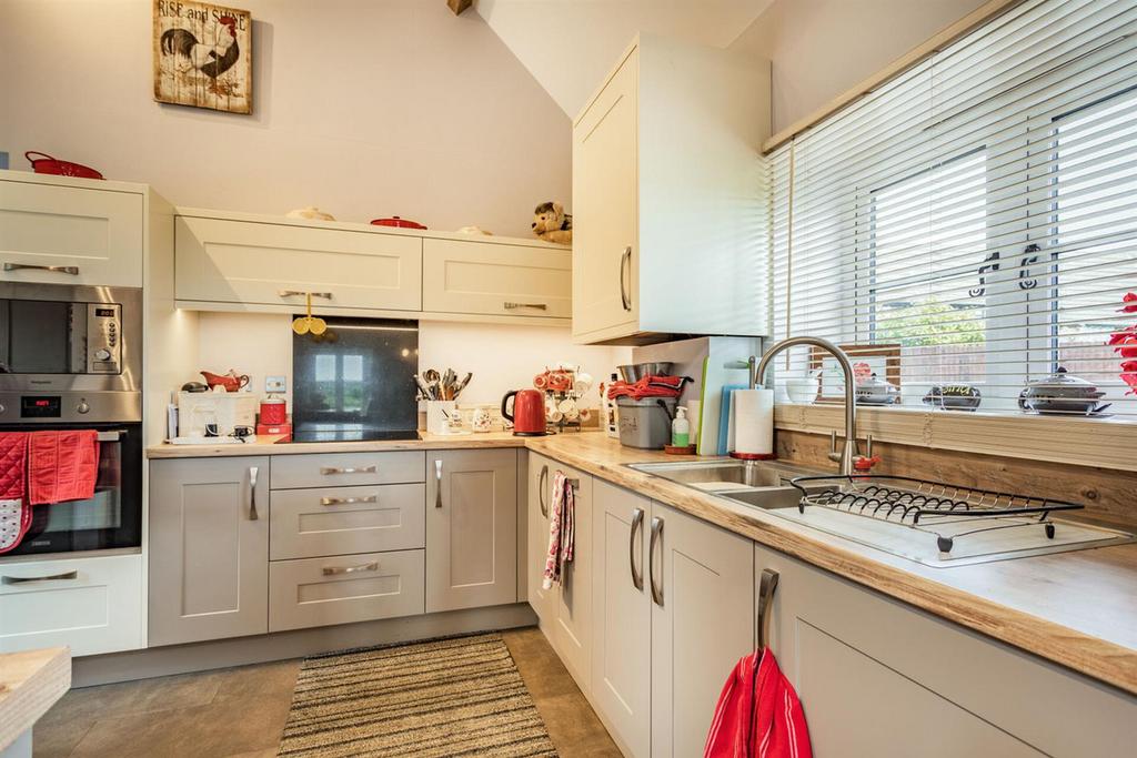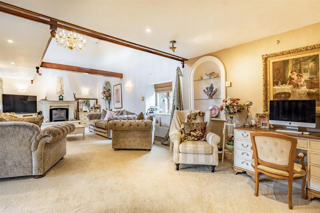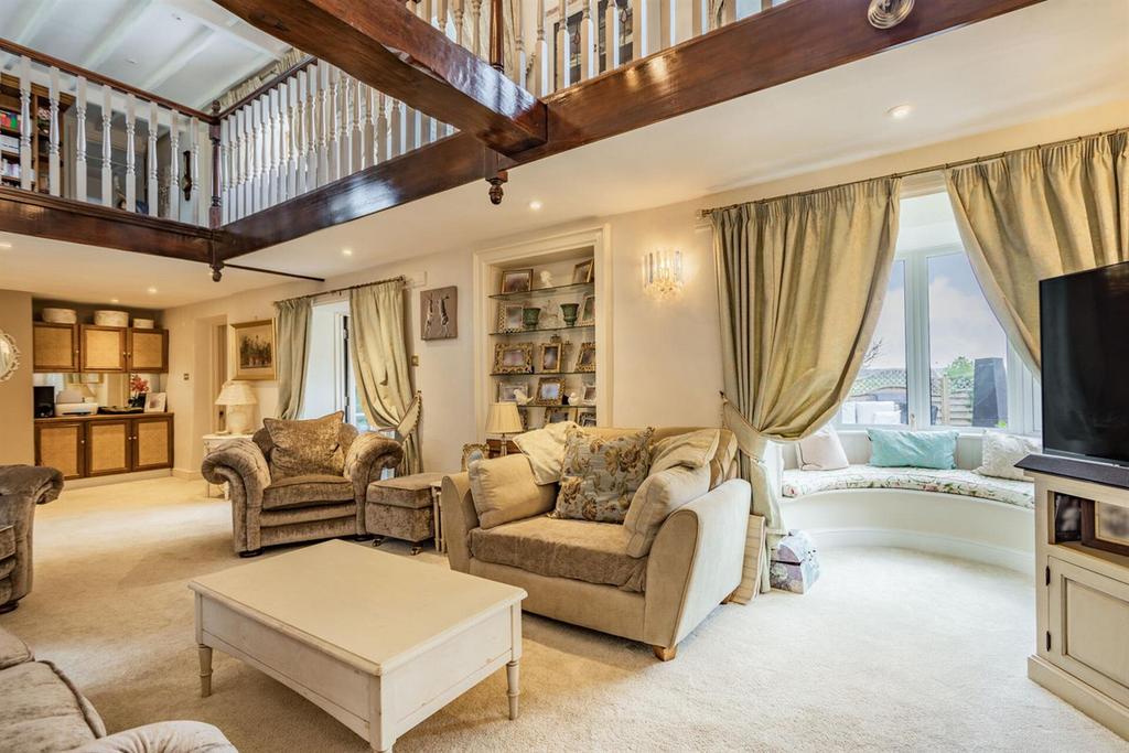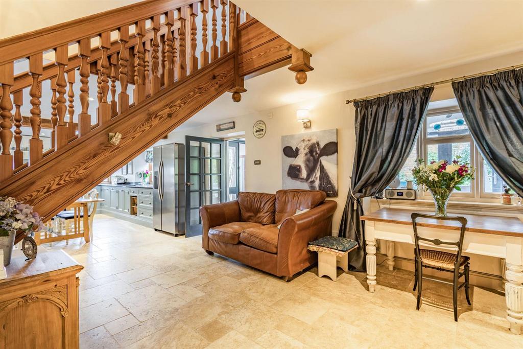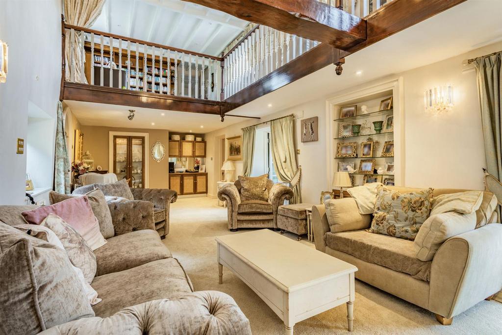The main house is beautifully light and spacious and has retained many original features. The front door opens to a lobby area with cloakroom and leads into a superb conservatory/dining hall. The main reception room is just stunning with a vaulted ceiling, open fireplace and gallery/mezzanine library. The central hallway/dining room has an original inglenook and leads to the hub of this superb home the country style kitchen/breakfast room, its a wonderfully bright room with plenty of space for family entertaining, the kitchen area is fitted with traditional units with integrated appliances, and an Aga. Leading off the kitchen is a separate Family room, a double bedroom with walk in wardrobe and a large utility/gym.