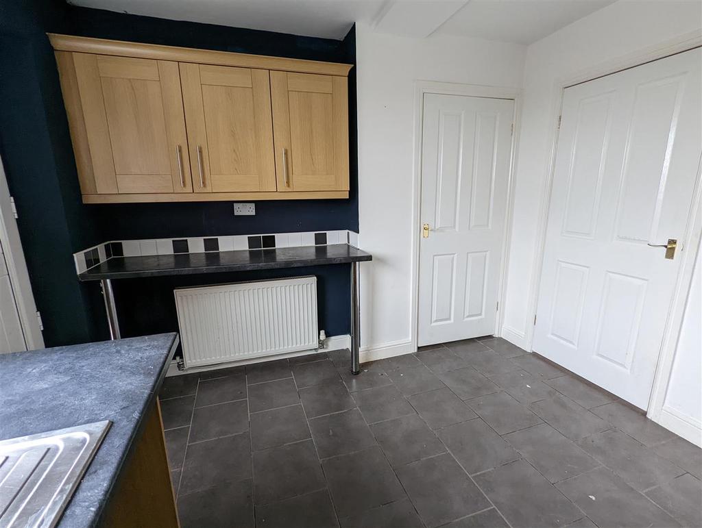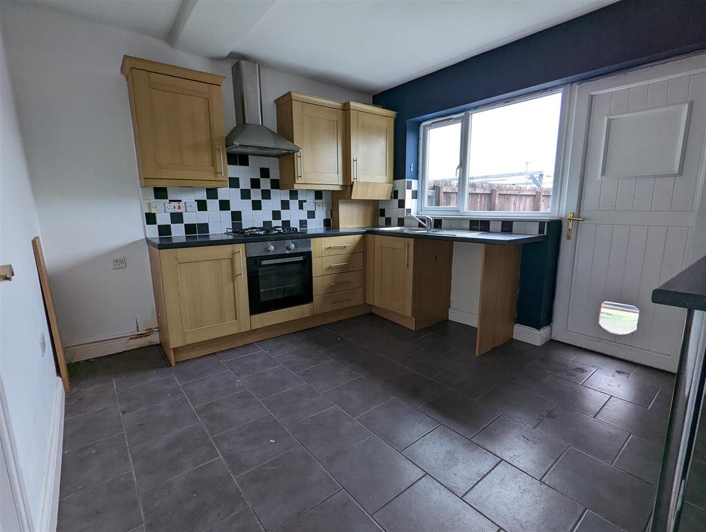 Located to the rear of the property, fitted with a range of modern wall and base units, corresponding work surfaces, stainless steel sink drainer unit, ceramic tiled splashbacks, built-in electric oven and gas hobs with extractor hood over, ceramic tiled flooring, central heating radiator, UPVC double glazed rear window and door.