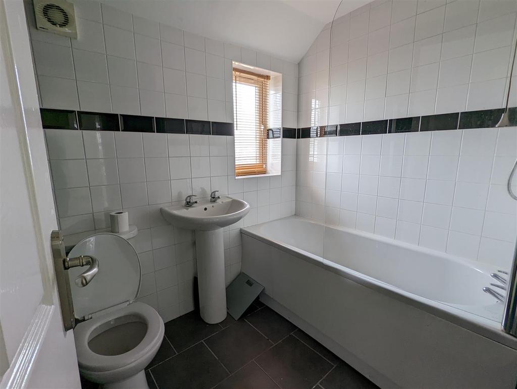 Fitted with a modern white suite including panelled bath with electric shower over and glass screen, pedestal wash hand basin, low level w/c., chrome heated towel rail, part ceramic tiled walls, tiled flooring, extractor fan and UPVC glazed window.