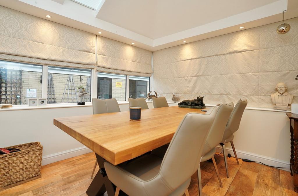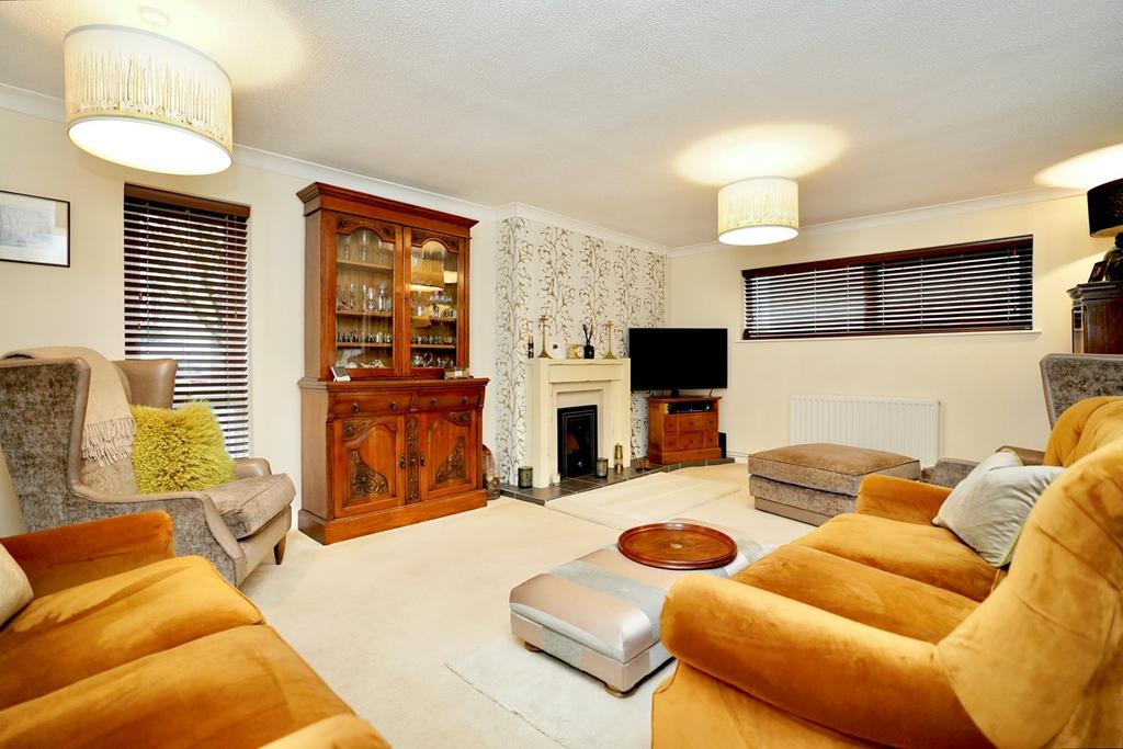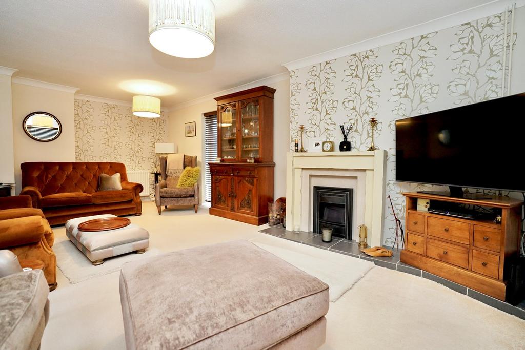 A triple aspect room with double glazed window to front and side aspects, patio doors to rear aspect with remote controlled blinds, coving to ceiling, central feature fire place with inset Valer electric remote controlled fire, two radiators.
