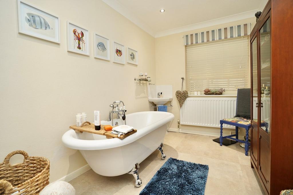 Previously Bedroom 3, fitted in a two piece suite comprising roll top free standing bath with telephone style mixer tap hand shower, wash hand basin, radiator, coving to ceiling, recessed down lighters (can easily be turned back to bedroom)