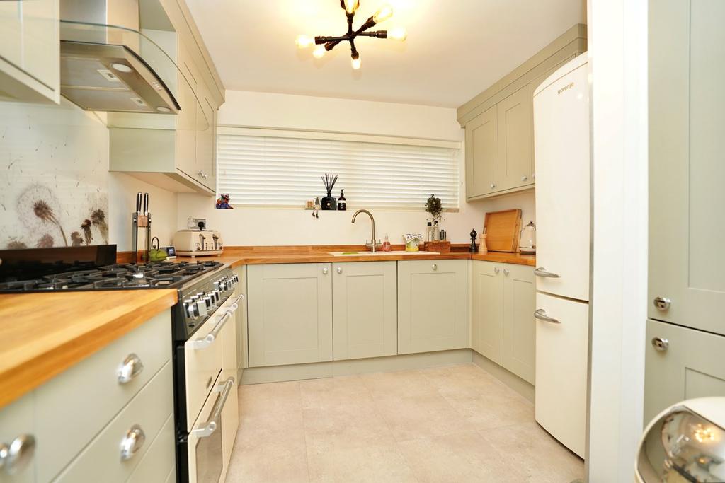 9' 6" x 9' 6" (2.90m x 2.90m) Re-fitted in a range of base, drawer and wall mounted units with solid timber work surfaces and matching up-standers, pantry, one and a half bowl single drainer sink unit with mixer tap, range style cooker with Zanussi glass and chrome cooker hood over, integrated AEG dishwasher and AEG washing machine, space for fridge freezer, radiator.