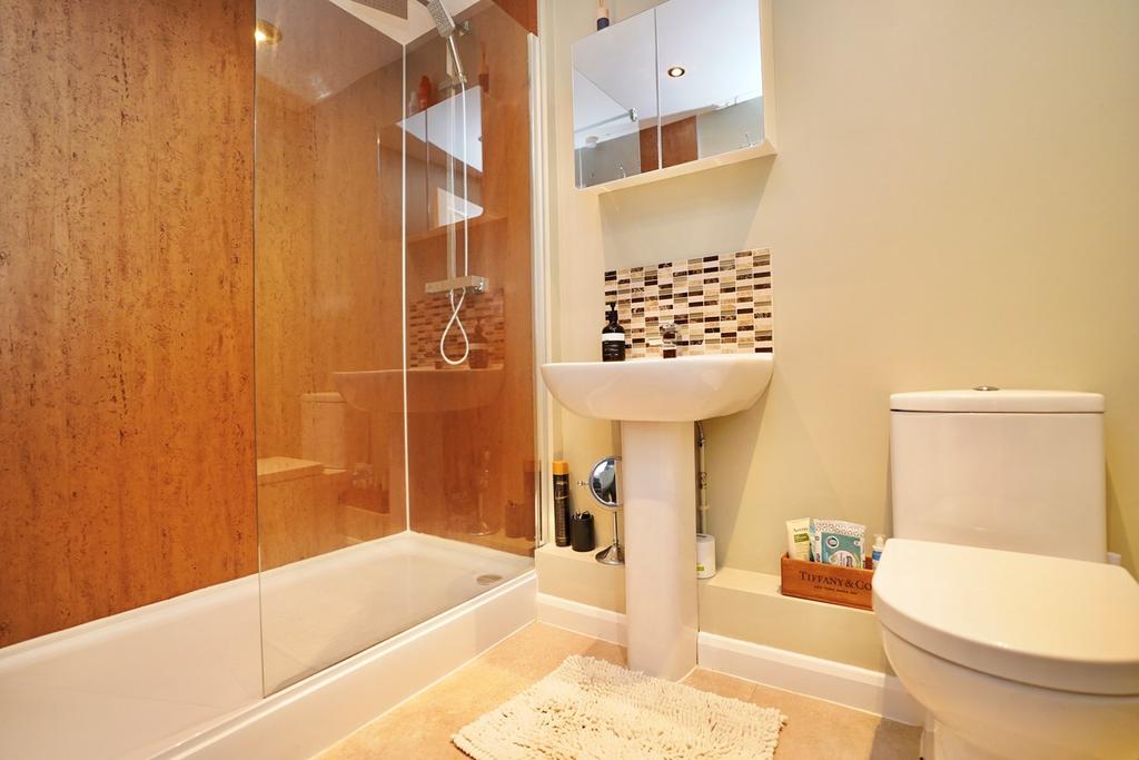 Re-fitted in a three piece suite comprising low level WC, wash hand basin, double shower cubicle with glazed screen and drench style shower over with separate hand held attachment, recessed down lighters, heated towel rail.