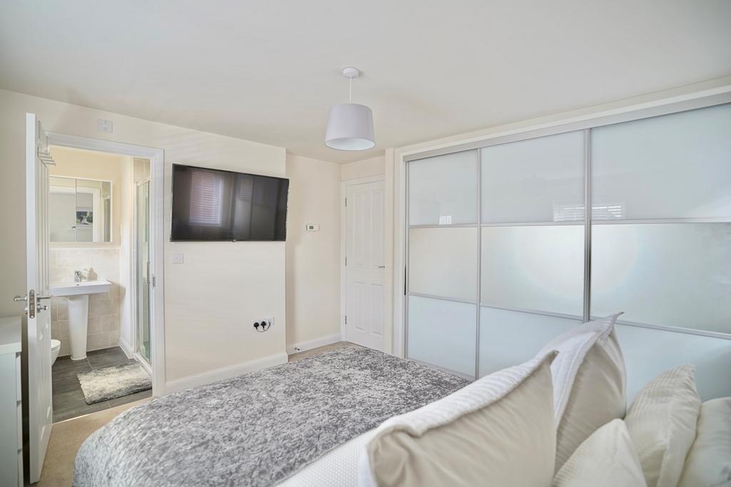 A light double aspect room with UPVC windows to front and side aspects, double panel radiator, extensive contemporary wall panelled wardrobe range with hanging and shelving, TV point.