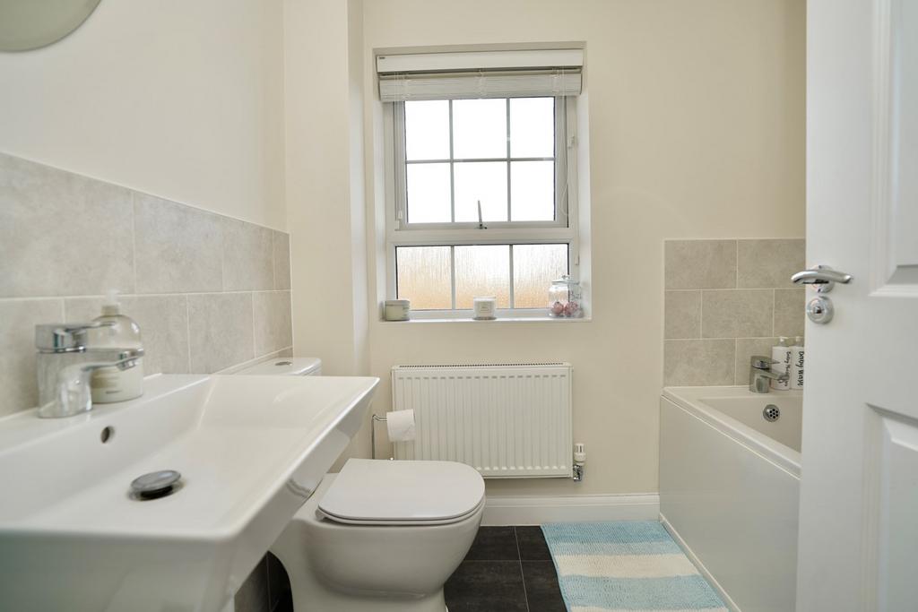Fitted in a three piece contemporary white suite comprising low level WC, pedestal wash hand basin with mixer tp, double panel radiator, panel bath with mixer tap, UPVC window to garden aspect, extractor, vinyl flooring.