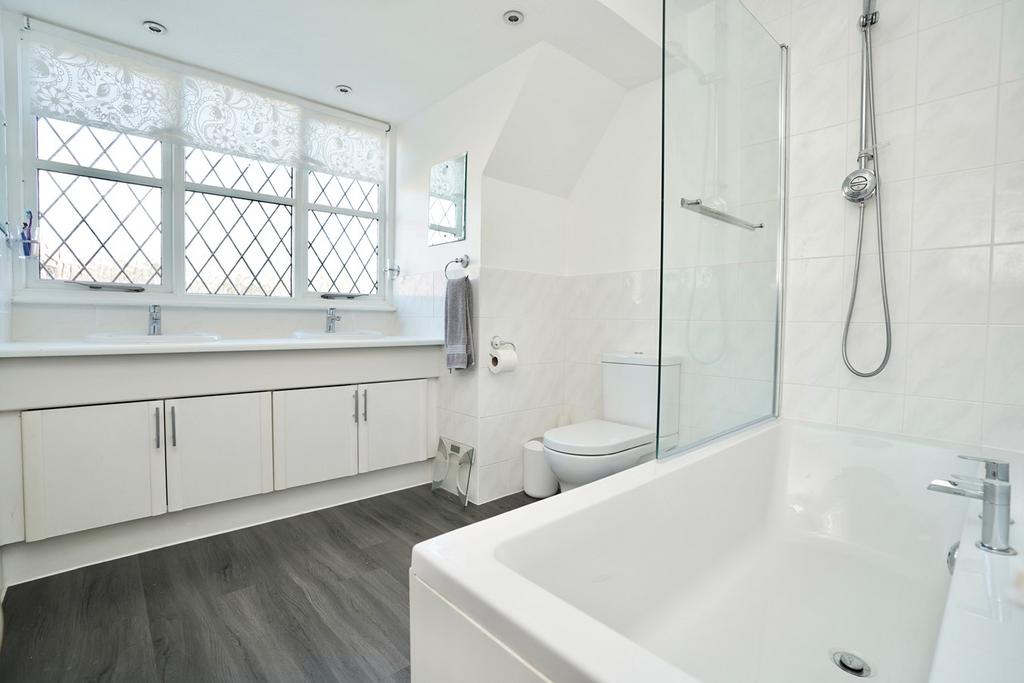 Fitted in a four piece suite comprising low level WC, His and Hers vanity wash hand basins, panel bath with independent shower unit fitted over, sealed unit window to side aspect, heated towel rail, recessed down lighters.