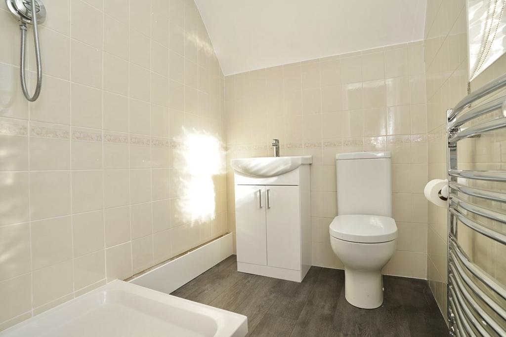Re-fitted in a three piece suite comprising low level WC, vanity wash hand basin, screened shower enclosure with independent shower unit fitted over, sealed unit window to side aspect, heated towel rail.