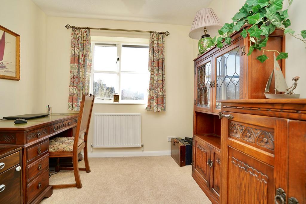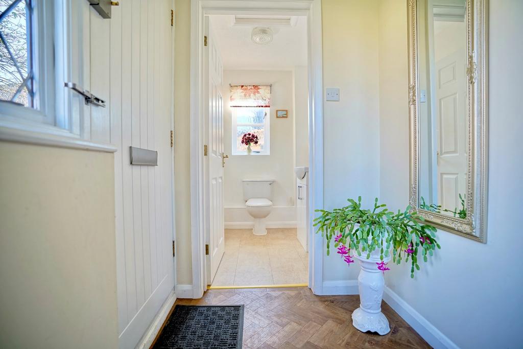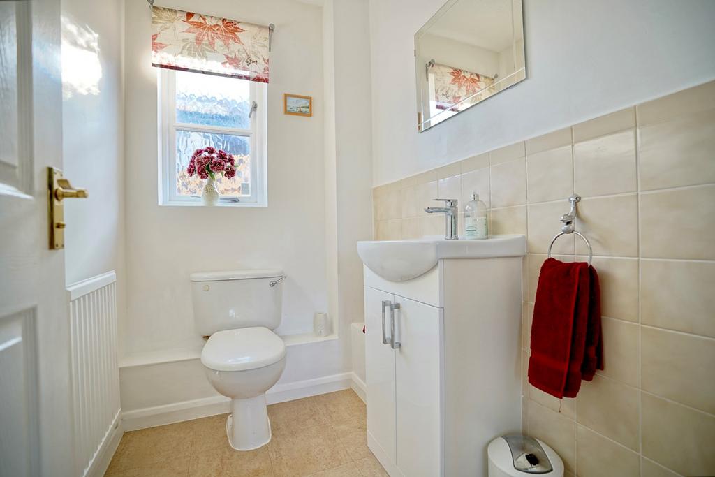 Re-fitted in a two piece suite comprising low level WC, vanity wash hand basin and tiling, sealed unit window to side aspect, radiator, access to loft space, Karndean flooring.