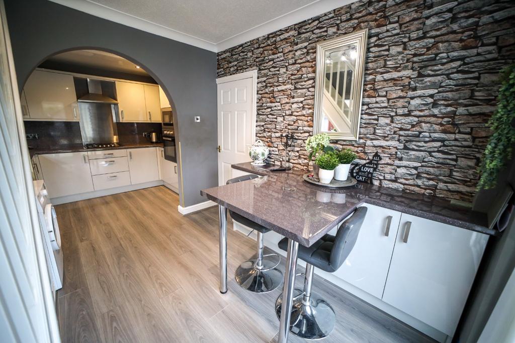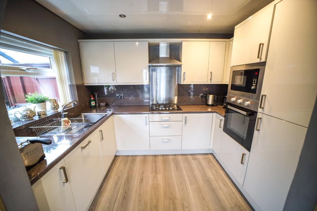 Modern Kitchen fitted with High Gloss Wall & Base Units complimented by Laminate Worktops, Breakfast Bar and Stainless Steel Sink & Drainer.