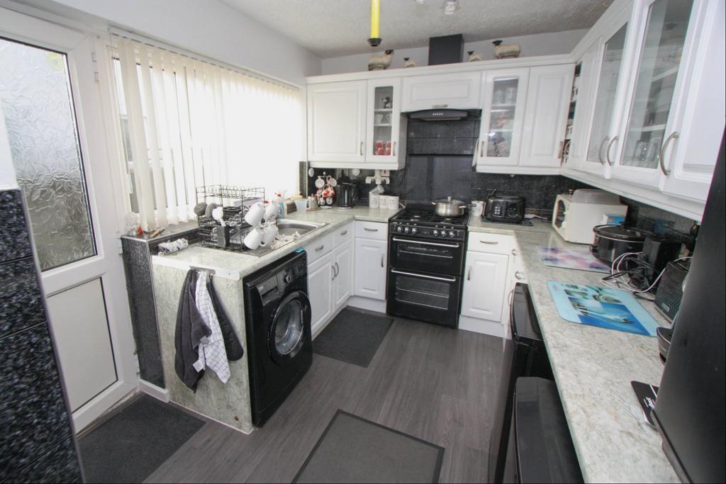 Accessed by the front and side door offering four ring gas cooker with extractor over, sink and drainer, with space for a fridge, freezer and washing machine. With partly tiled walls, storage cupboard for utility space, window, power points and radiator.