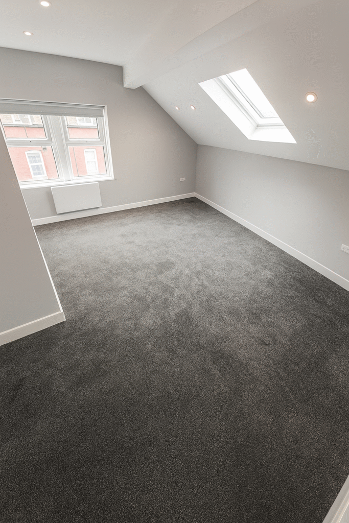 LIVING ROOM - As you enter the property through the hallway, you are greeted by a spacious open-plan living area with modern soft grey carpets and walls. There is ample space for large furniture such as a sofa and dining table, allowing you to create your ideal room to relax and entertain, as well as windows creating a bright and airy feel.