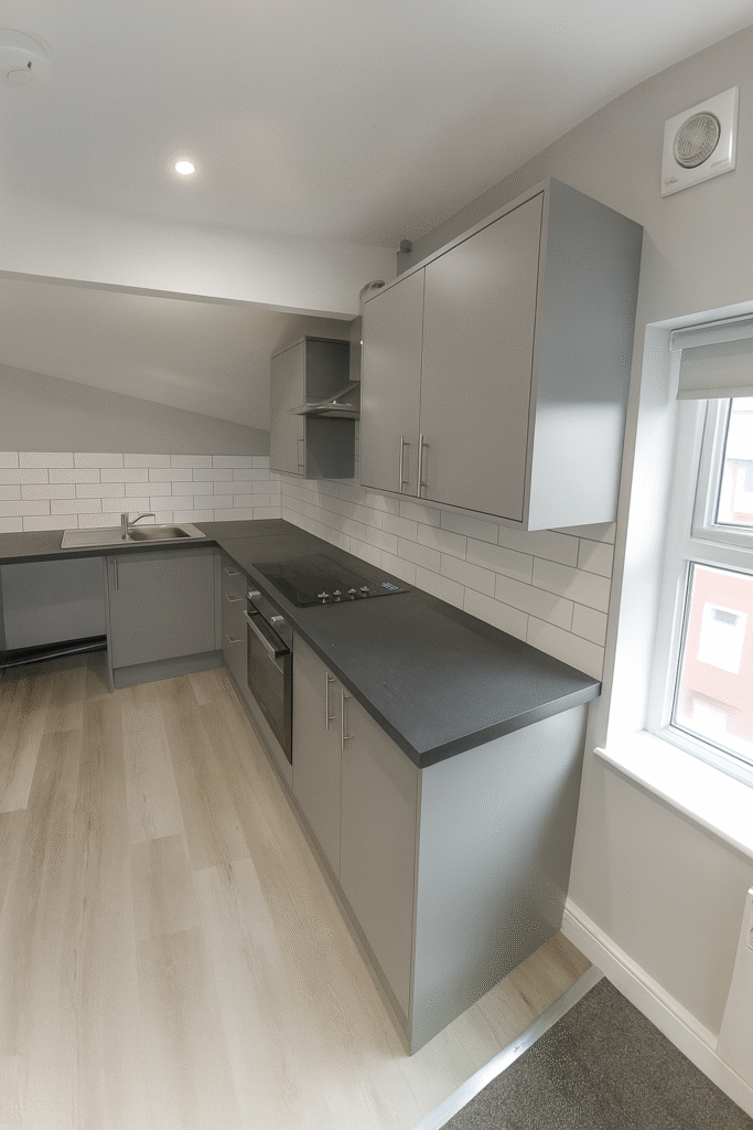 KITCHEN - Connected to the living area is the stylish kitchen, with wooden laminated flooring and white tile splashback. Sleek grey cabinets and black worktops provide plenty of storage and preparation space, alongside an integrated hob/oven, extractor fan, stainless steel sink and space for appliances. The space opens up into the living room for convenient open-plan living.