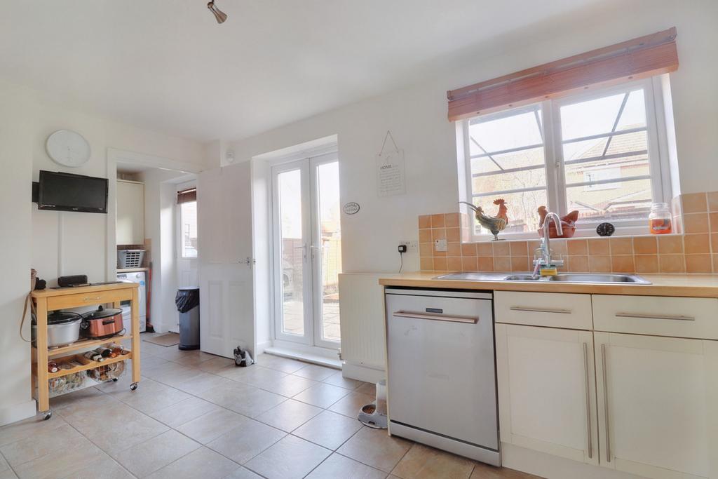 A range of wall and base level units. Stainless steel sink and drainer with mixer tap over. Tiled flooring. Glazed door to the rear aspect.