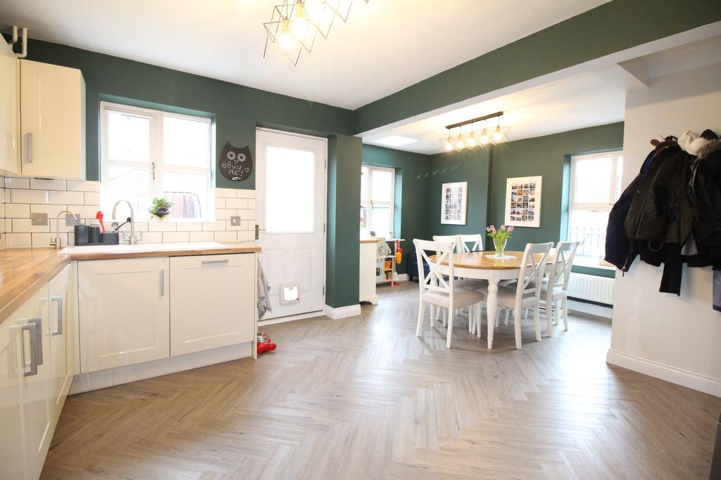A standout feature of this lovely property is its fitted kitchen/dining room. The room offers ample wall and base mounted cabinets, as well as integrated appliances. There is a great deal of space for a family size dining table and chairs. Dual aspect windows bring in an abundance of natural light into the home with a rear door providing access to the enclosed rear garden.