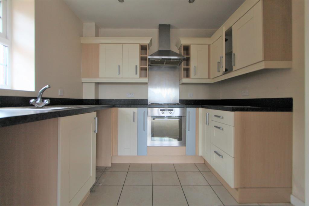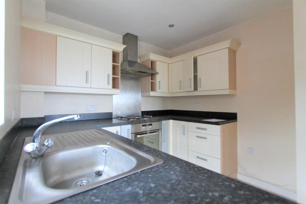 Fitted kitchen having wall and base mounted cupboards with worktops over, electric hob with oven and extractor hood, plumbing for washing machine, space for freestanding fridge/freezer, spot lights to ceiling, tiled flooring and double glazed window to the side aspect.